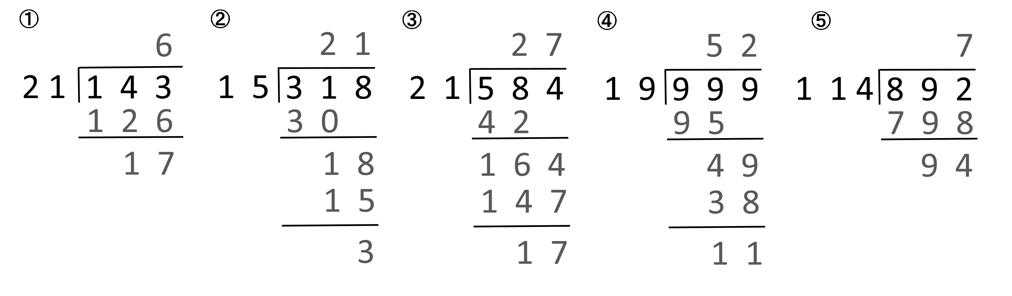 ① 143÷21 ② 318÷15 ③ 584÷21 ④ 999÷19 ⑤ 892÷114