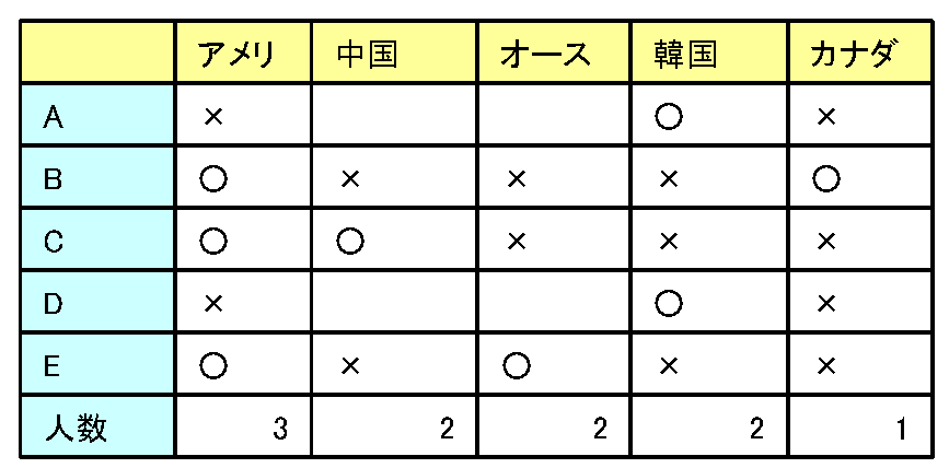 - 【問題】アメリカ、中国、オーストラリア、韓国、カナダへ行ったことがあるかどうかを、A~Eの5人に尋ねた。アメリカ、中国、オーストラリア、韓国、カナダに行ったことがある人数がこの順にそれぞれ3人、2人、2人、2人、1人であるとする。