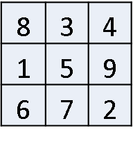 【問題】1~9までの数字を下のマスに埋めて縦,横,斜めを足すとすべて等しくなるようにしたい。?に入る数字は?