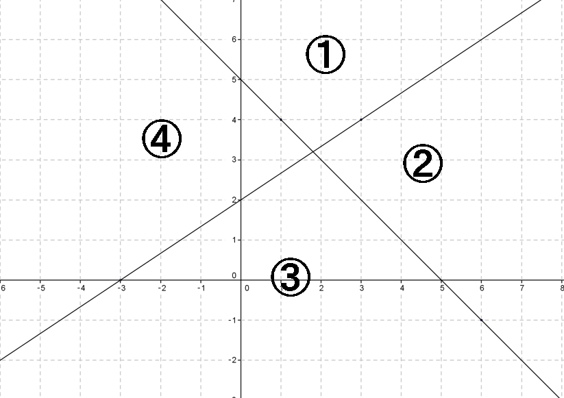 【問題】Y=-X+5,Y=2X/3+2の直線の式を以下のように4つの領域に分割される。
