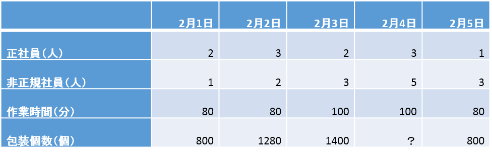 - 【例題】以下の表は各日程における包装作業にかかった時間と個数についての表である。?に推測される数字は?