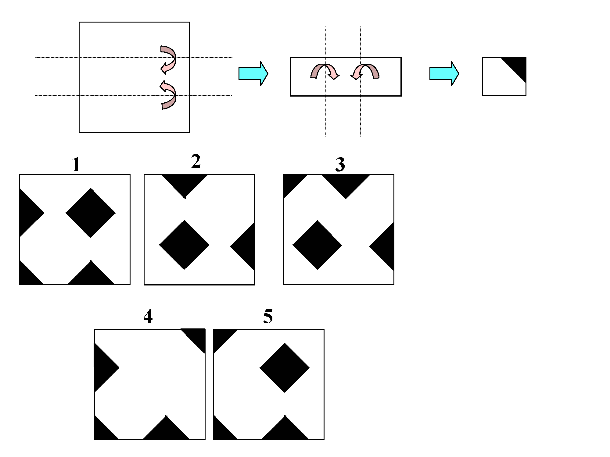 【問題】下の図のように正方形の紙の点線の部分を2回谷折りし、その後黒い部分を切り取った後に紙を広げた際にできる図形として正しいものはどれか?