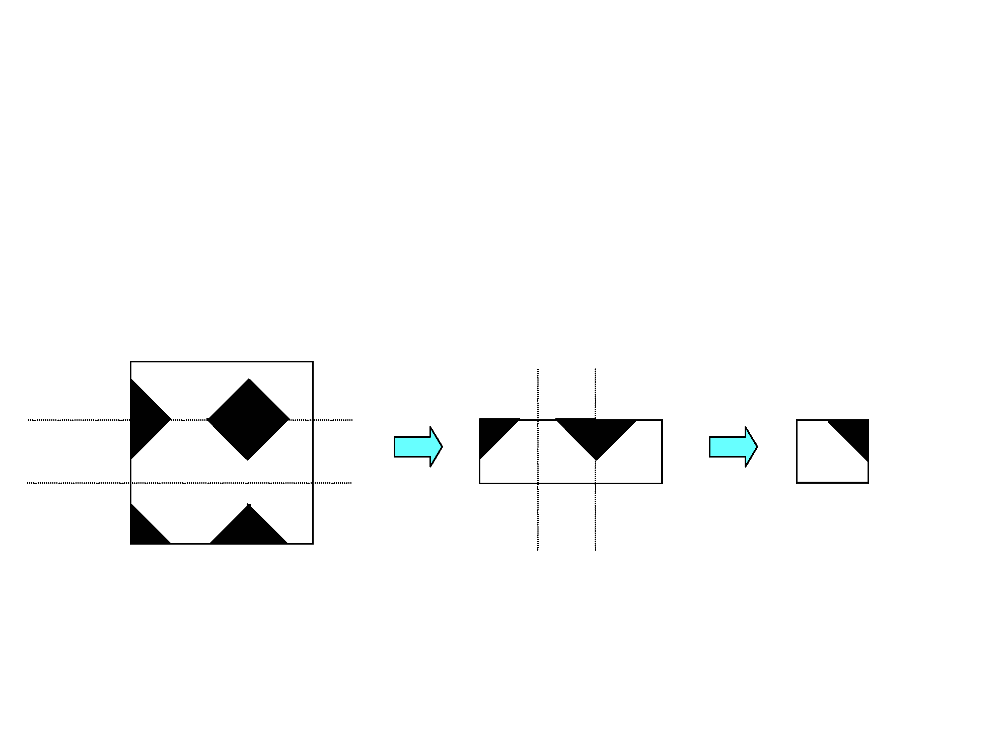 - 【問題】下の図のように正方形の紙の点線の部分を2回谷折りし、その後黒い部分を切り取った後に紙を広げた際にできる図形として正しいものはどれか?