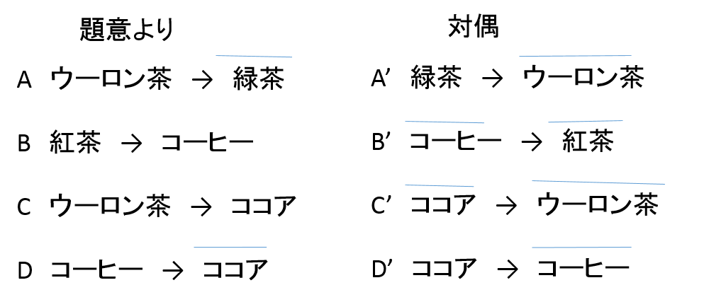 - 【問題】ウーロン茶が好きな人は緑茶が嫌い、紅茶が好きな人はコーヒーが好き、ウーロン茶が好きな人はココアが好き、コーヒーが好きな人はココアが嫌い。以上のことが言えるとき以下の内正しい選択の組み合わせは?