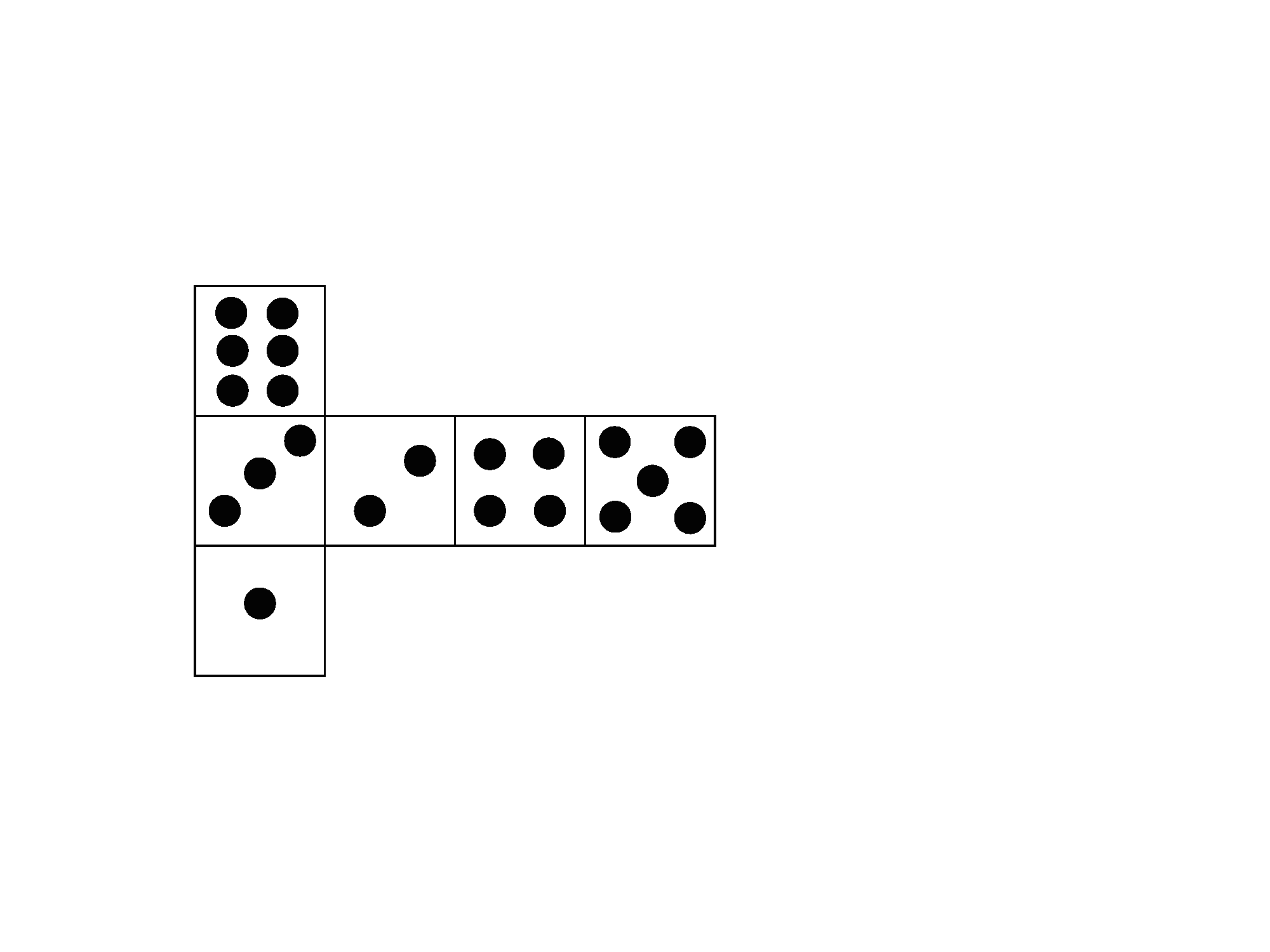 - 【問題】左図の展開図で組み立てられるサイコロを7つ右図のように並べた。接している二つの面の和がすべて等しい時、接している面の数の総和を求めよ。