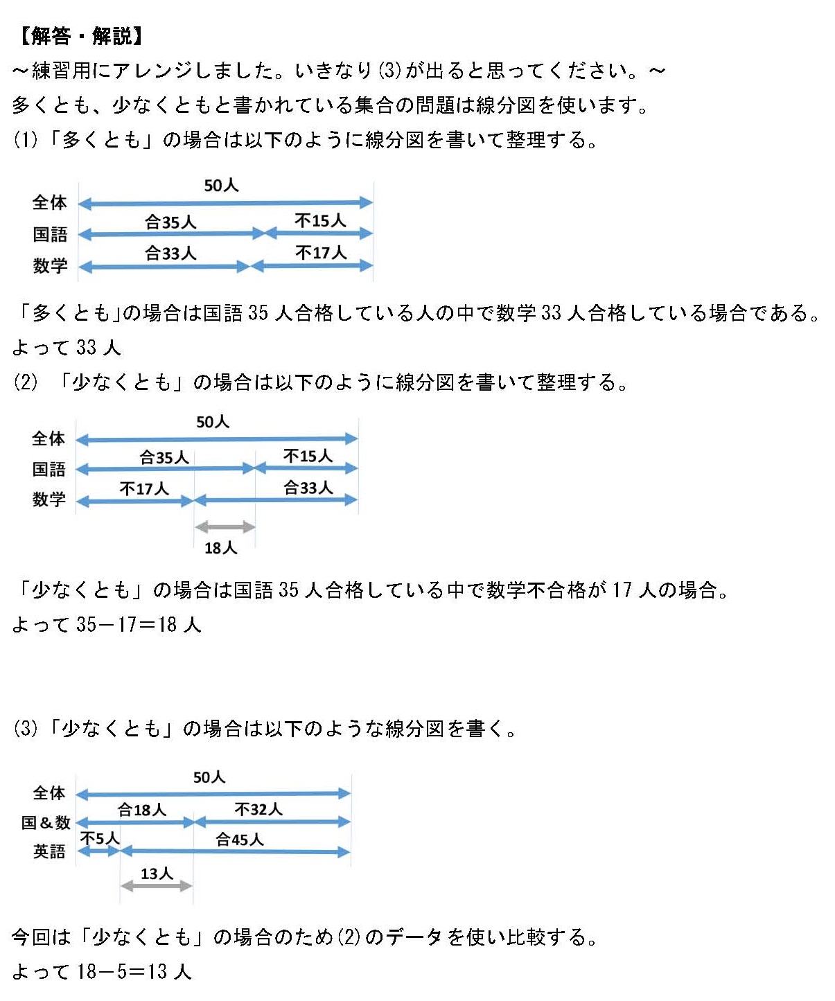 - 【問題】クラスに50人の生徒がいる。国語に合格した人は35人、数学に合格した人は33人、英語に合格した人は45人いた。