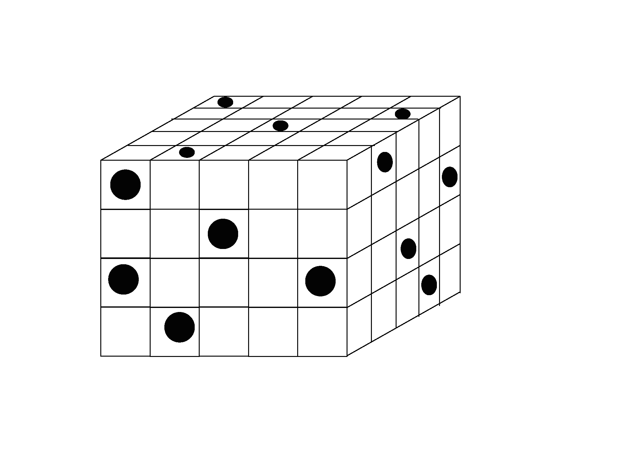- 【問題】100個の直方体があり下のように積み重ねた。黒丸の部分を突き刺し反対側まで貫通させる場合、貫通した直方体の数を求めよ。