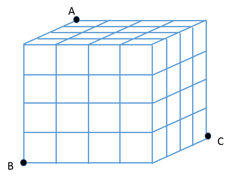 - 【問題】下図は1辺の長さが1cmの小さい立方体を積んで大きな1辺の長さが4cmの立方体を作った。下図の点A,点B,点Cを通る平面で切断すると、いくつの小立方体を切断することになるか。